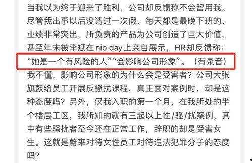 这起蔚来女员工爆料事件让我们看到了职场问题的严重性。希望每一位员工都能在职场中找到自己的位置,勇敢地追求自己的权益。同时,也希望企业能够重视员工的需求,共同营造一个美好的职场环境。